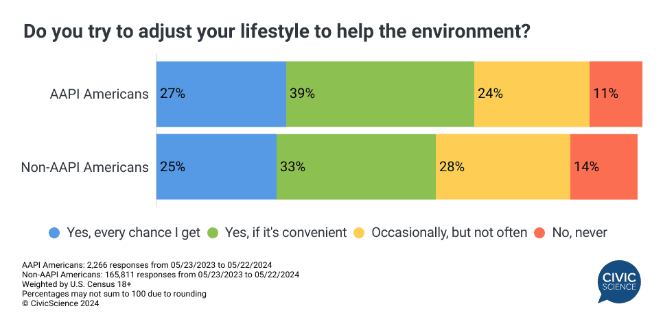 CivicScience data reveal that although AAPI individuals report less strong concern about climate change and the environment overall, they are more likely than non-AAPI individuals to adjust their lifestyle to help out environmental causes.