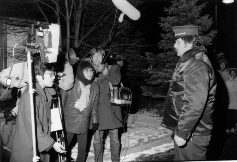 Renee Tajima-Peña, Christine Choy and their crew during an interview with a police officer who witnessed the fatal attack on Vincent Chin.